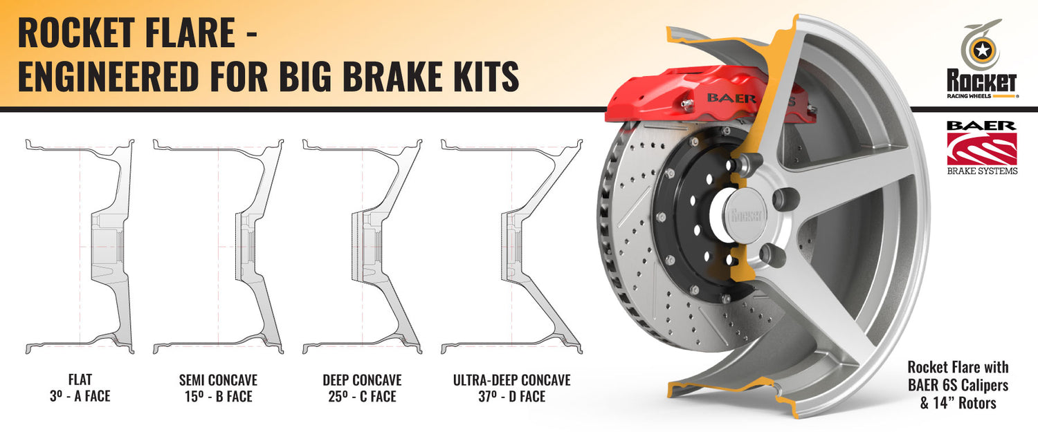 Using the single direction flow forming as the catalyst for the high performance wheel, Rocket is proud to offer the Flare with four face angles that provide massive brake caliper clearance for today's modern brakes for vintage muscle cars and trucks, along with fitments for some late model modern muscle cars. Rocket has redesigned the barrel profile and drop center to maximize brake clearance in areas that commonly conflict with big brake kits.