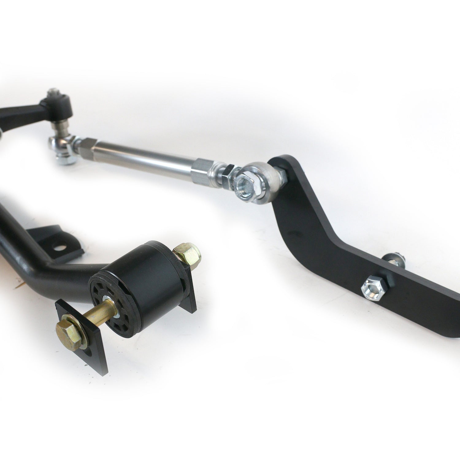 - Includes upper and lower StrongArms, tall spindles, steering arms, inner tie rods, outer tie rods, billet tie rod adjusters, and center link adapter.