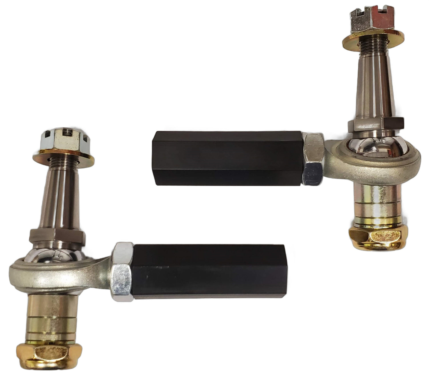 The adapter sleeves are black hardcoated aluminum hex that thread directly onto the OE inner tie-rods with no modifications necessary and feature chromoly rod-ends with teflon wear liners.