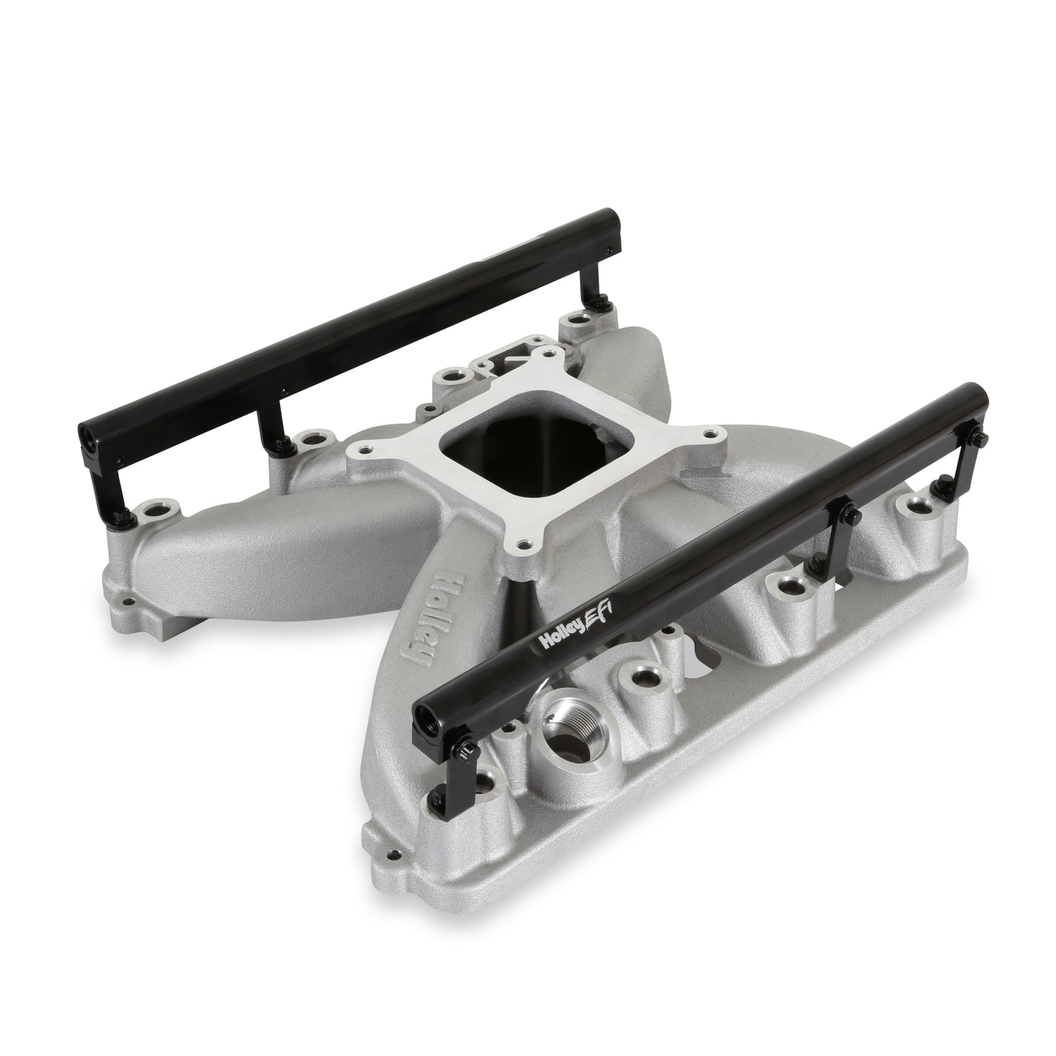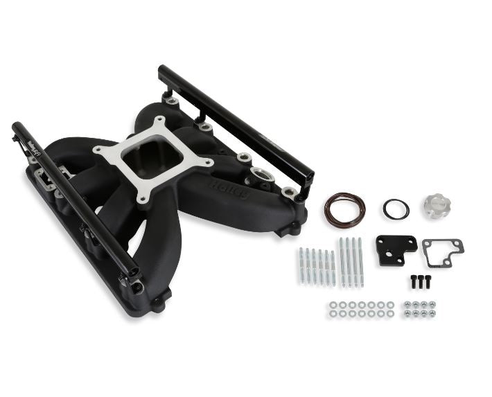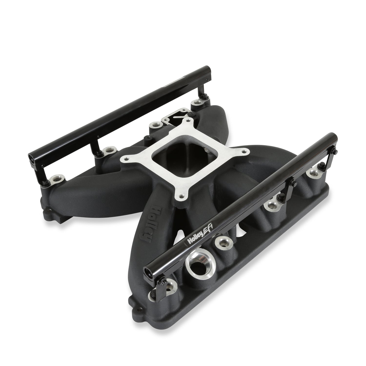 These new single-plane intake manifold kits are designed for 2009-Current 5.7-liter, 2005-2010 6.1-liter, and 2011-Current 6.4-liter Chrysler Gen III Hemi engines. They provide maximum hood clearance combined with plenum and runner geometry that provide a broad RPM powerband for high-performance street/strip engine applications to a maximum engine speed of 7500 RPM. The isolated design of the air/fuel passages helps to increase charge air density and performance. 300-930 and 300-930BK are designed for 4150 type throttle valves. Included are billet fuel rails along with mounting brackets for either Bosch EV-1 type fuel injectors or most Gen III Hemi OEM injectors.