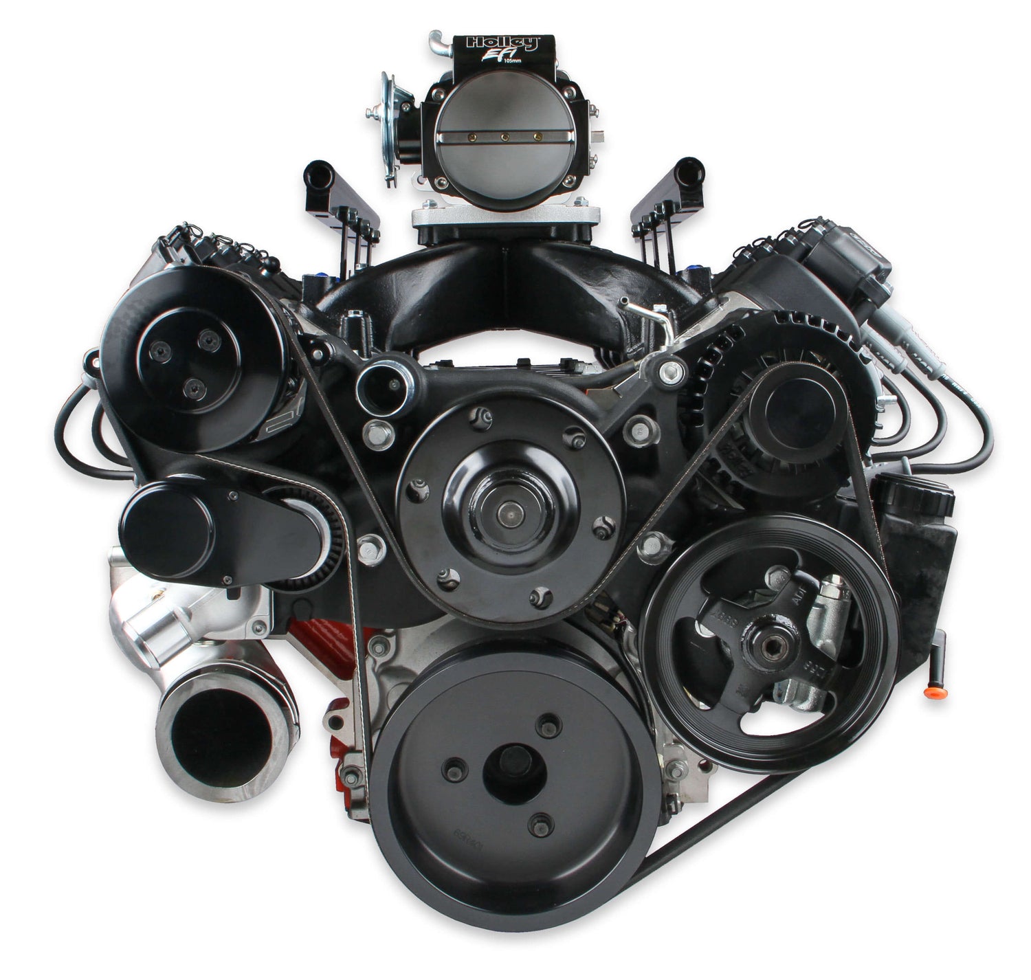 Holley's Mid-Mount complete accessory system has all accessories pulled in tighter than other accessory drives. At the heart of the system is a "bracketless" design, where the accessories bolt directly to the water pump for a clean, integrated form. The design offers superb engine visibility to show off your horsepower, not your accessories.