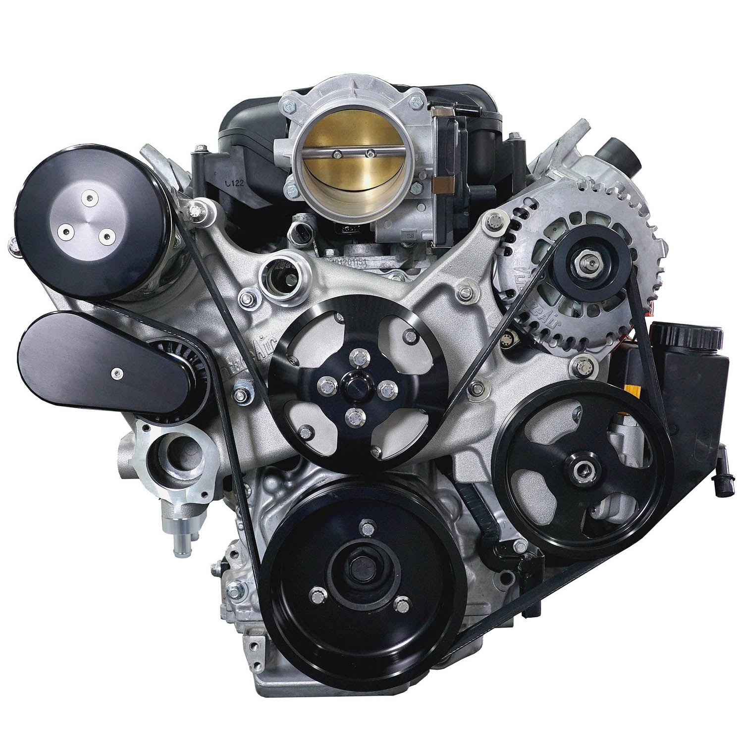 Black Anodized w/Chrome Accessories: Includes a power steering pump with natural finish pump housing, chrome compressor and alternator, hardcoat black pulleys, black clutch and tensioner covers. PN: 175043