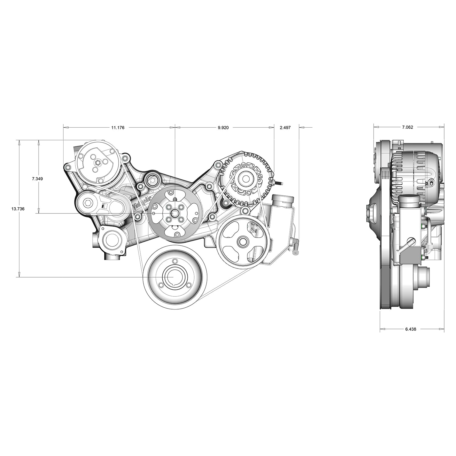 Chrome Pulleys w/Polished Accessories: Includes a power steering pump with natural finish pump housing, polished compressor and alternator, chrome pulleys, polished clutch and tensioner covers. PN: 175037